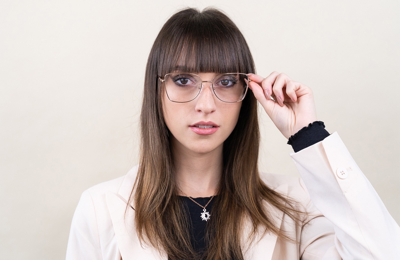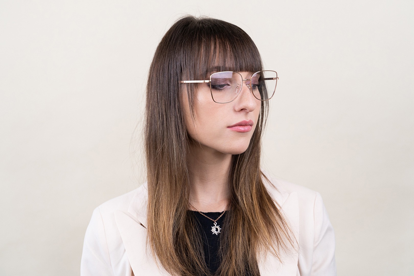 A keret arany színe tökéletesen illik a meleg bőrtónushoz és a sötét